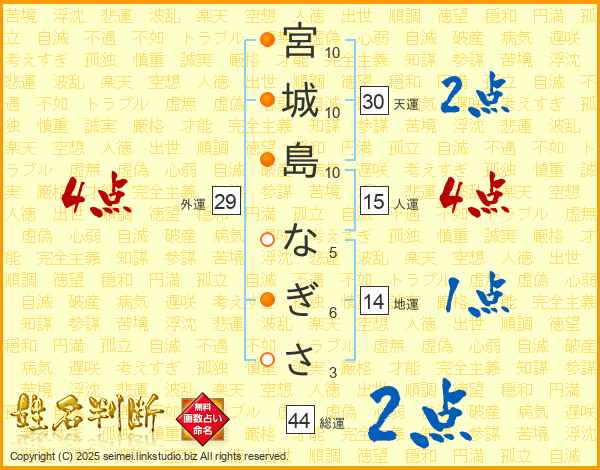 宮(10画)城(10画)島(10画) な(5画)ぎ(6画)さ(3画)