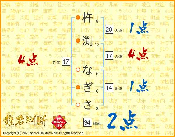 杵(8画)渕(12画) な(5画)ぎ(6画)さ(3画)