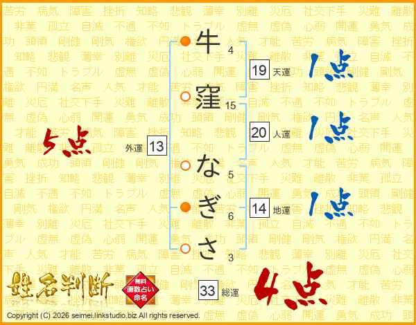 牛(4画)窪(15画) な(5画)ぎ(6画)さ(3画)