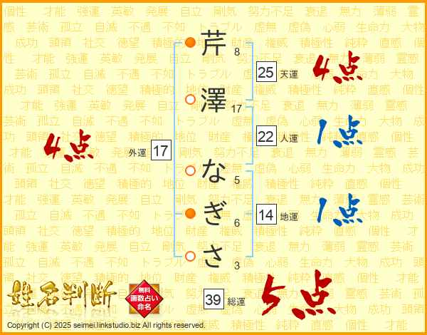 生活面を象徴する運勢です。外部から受ける影響力を表し、結婚運、家庭運や職場、環境への順応性を表します。総運から人運を引いた画数。姓や名が1文字の場合を除く。