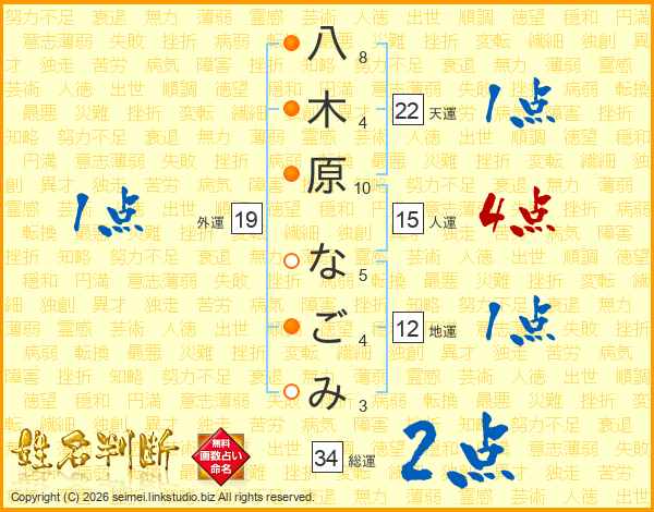 画数の奇数(○陽)と偶数(●陰)の配列で吉凶を占います。どちらかにかたよる名前は大凶名で避ける必要があります。画数の奇数偶数。