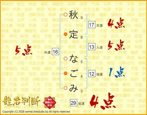 秋(9画)定(8画) な(5画)ご(4画)み(3画)