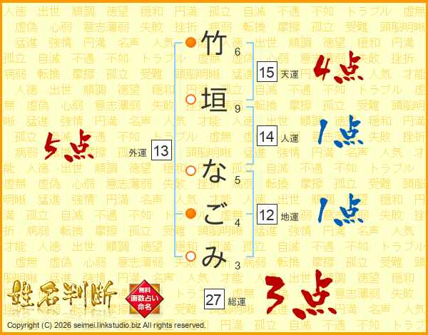 竹(6画)垣(9画) な(5画)ご(4画)み(3画)