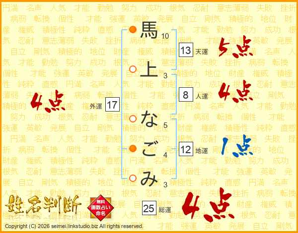 馬上なごみさんの天運は13画の5点!