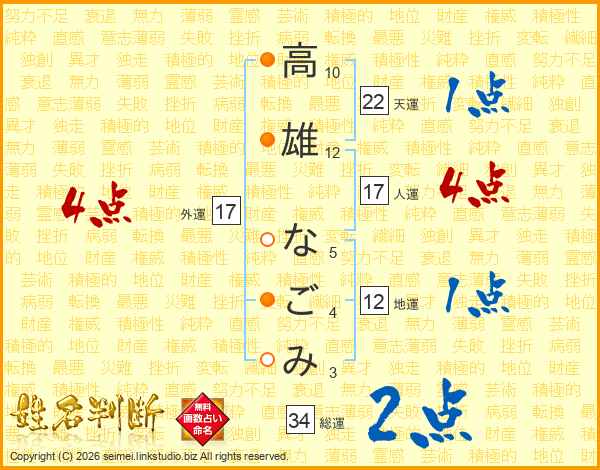 高(10画)雄(12画) な(5画)ご(4画)み(3画)
