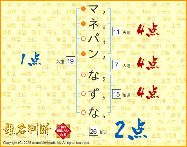 マ(2画)ネ(4画)パ(3画)ン(2画) な(5画)ず(5画)な(5画)