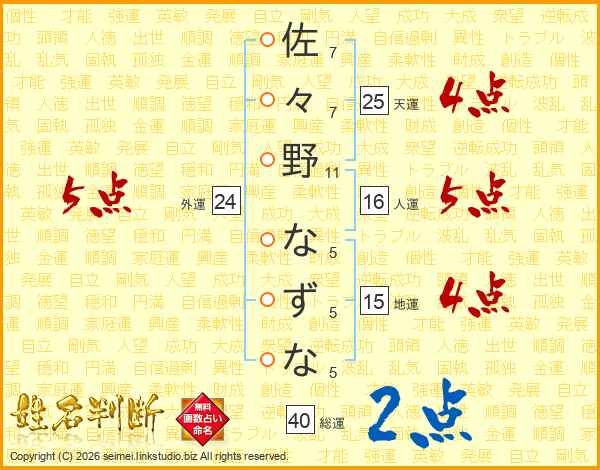 佐々野なずなさんの総運は40画の2点!
