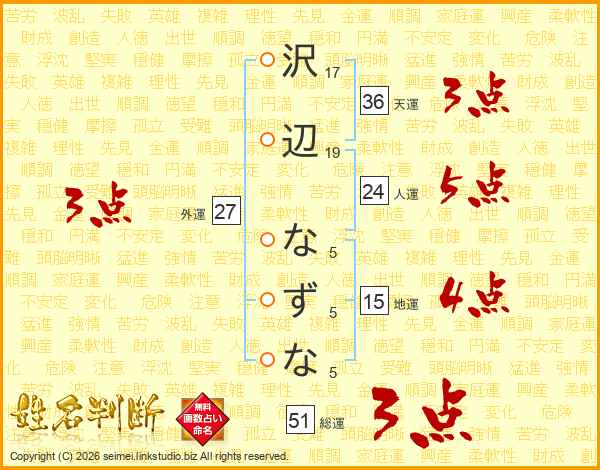 沢辺なずなさんの総運は51画の3点!