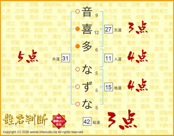 音(9画)喜(12画)多(6画) な(5画)ず(5画)な(5画)
