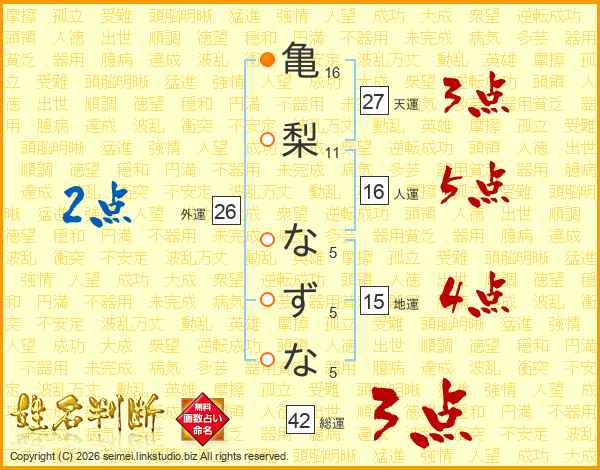 亀(16画)梨(11画) な(5画)ず(5画)な(5画)