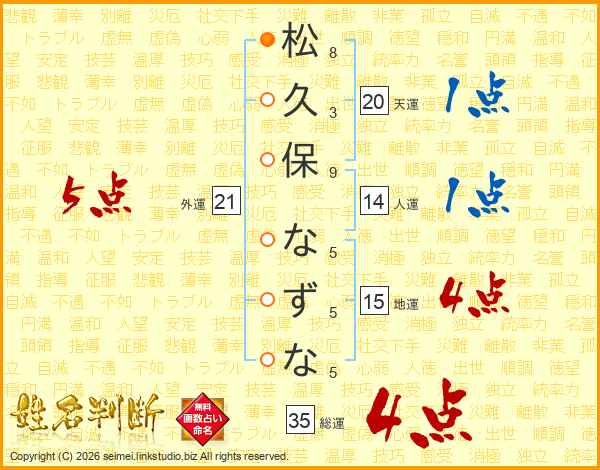 松(8画)久(3画)保(9画) な(5画)ず(5画)な(5画)