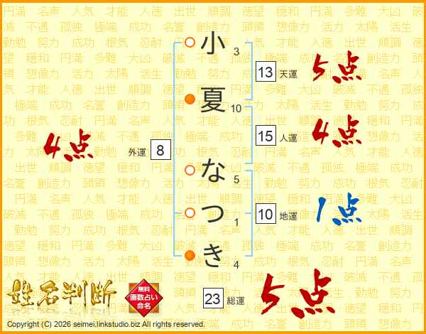 小(3画)夏(10画) な(5画)つ(1画)き(4画)