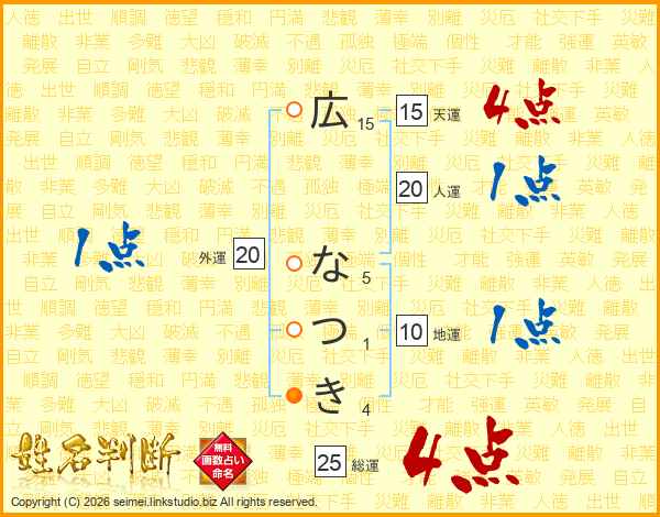 生活面を象徴する運勢です。外部から受ける影響力を表し、結婚運、家庭運や職場、環境への順応性を表します。総運から人運を引いた画数。姓や名が1文字の場合を除く。