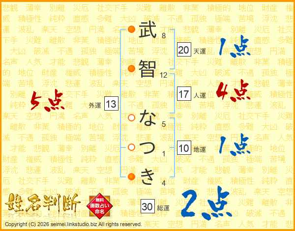 武(8画)智(12画) な(5画)つ(1画)き(4画)