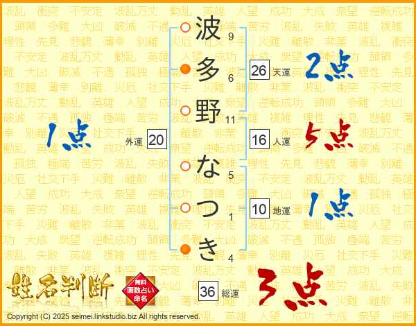 波(9画)多(6画)野(11画) な(5画)つ(1画)き(4画)