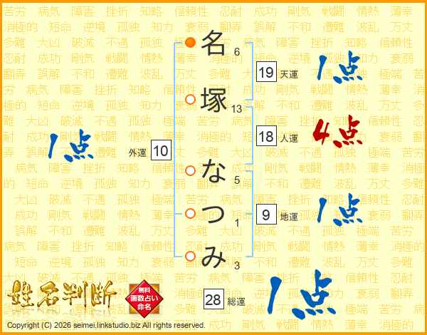 名(6画)塚(13画) な(5画)つ(1画)み(3画)