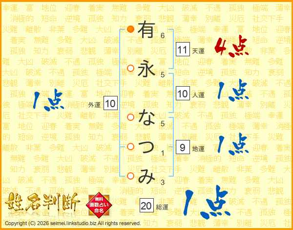 有(6画)永(5画) な(5画)つ(1画)み(3画)