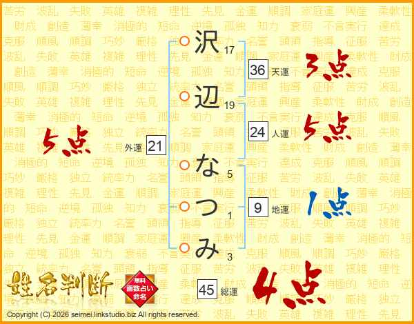 沢辺なつみさんの総運は45画の4点!