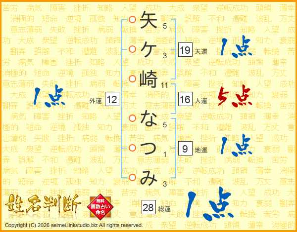 矢ケ崎なつみさんの総運は28画の1点!