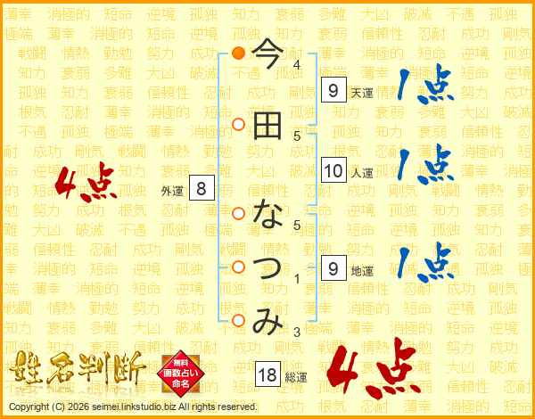 今(4画)田(5画) な(5画)つ(1画)み(3画)