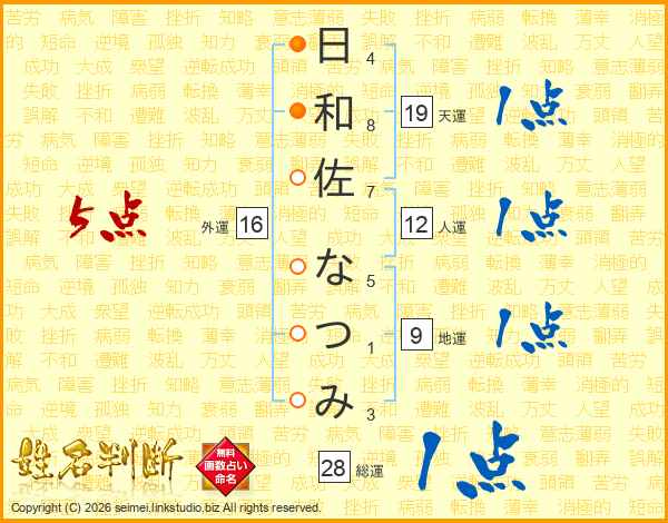 日(4画)和(8画)佐(7画) な(5画)つ(1画)み(3画)