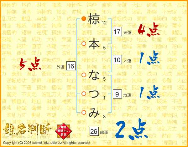 生活面を象徴する運勢です。外部から受ける影響力を表し、結婚運、家庭運や職場、環境への順応性を表します。総運から人運を引いた画数。姓や名が1文字の場合を除く。