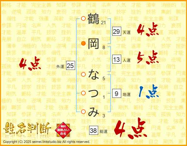 鶴(21画)岡(8画) な(5画)つ(1画)み(3画)