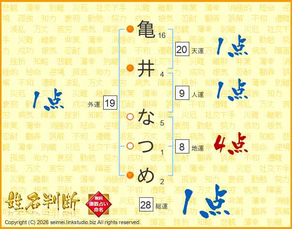 亀(16画)井(4画) な(5画)つ(1画)め(2画)