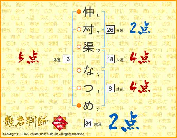 仲(6画)村(7画)渠(13画) な(5画)つ(1画)め(2画)