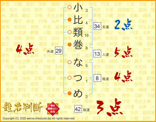 生活面を象徴する運勢です。外部から受ける影響力を表し、結婚運、家庭運や職場、環境への順応性を表します。総運から人運を引いた画数。姓や名が1文字の場合を除く。