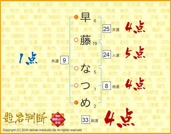 生活面を象徴する運勢です。外部から受ける影響力を表し、結婚運、家庭運や職場、環境への順応性を表します。総運から人運を引いた画数。姓や名が1文字の場合を除く。