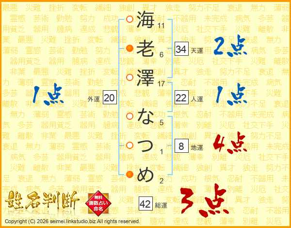 海(11画)老(6画)澤(17画) な(5画)つ(1画)め(2画)