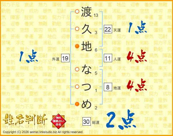 渡久地なつめさんの総運は30画の2点!