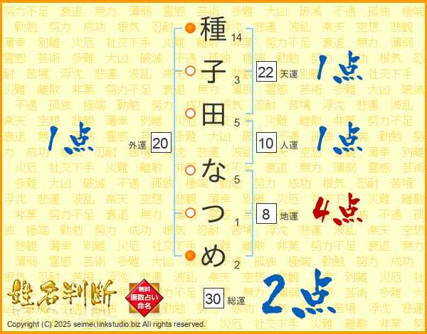 種(14画)子(3画)田(5画) な(5画)つ(1画)め(2画)