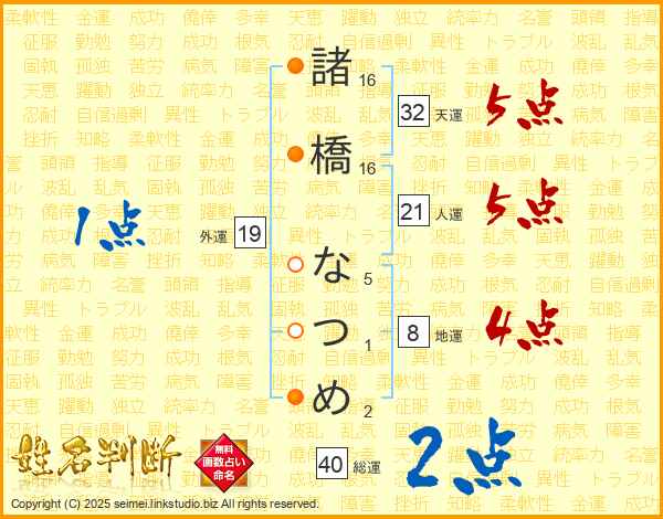 諸(16画)橋(16画) な(5画)つ(1画)め(2画)