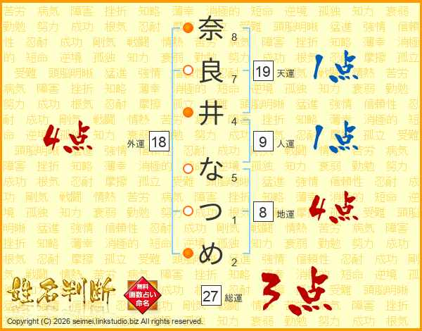 奈(8画)良(7画)井(4画) な(5画)つ(1画)め(2画)