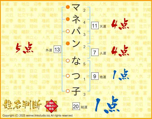 マ(2画)ネ(4画)パ(3画)ン(2画) な(5画)つ(1画)子(3画)