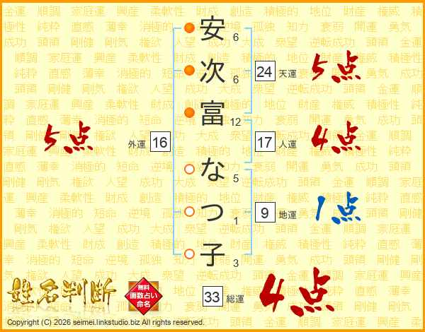 安(6画)次(6画)富(12画) な(5画)つ(1画)子(3画)