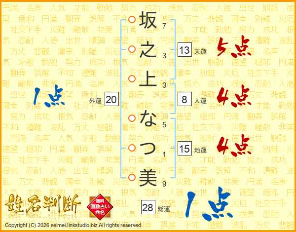 坂(7画)之(3画)上(3画) な(5画)つ(1画)美(9画)