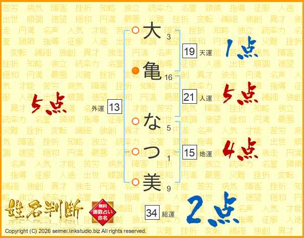 大亀なつ美さんの人運は21画の5点!