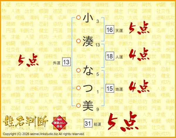 小(3画)湊(13画) な(5画)つ(1画)美(9画)