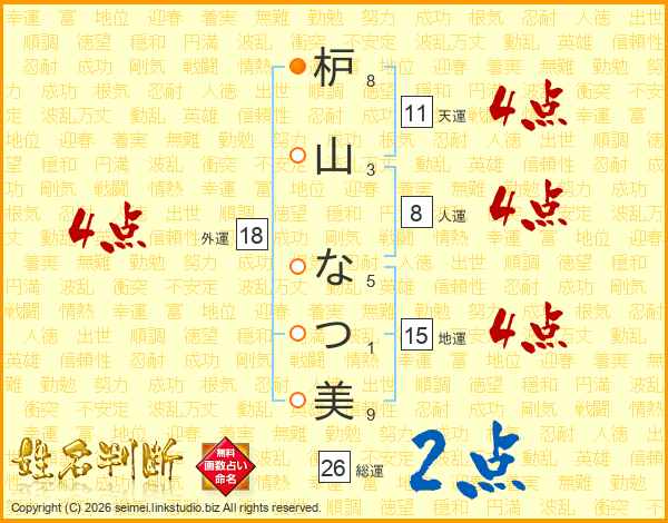 枦山なつ美さんの総運は26画の2点!