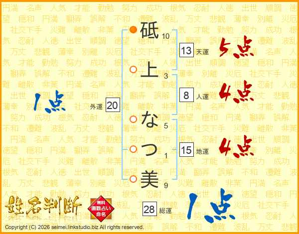 砥(10画)上(3画) な(5画)つ(1画)美(9画)