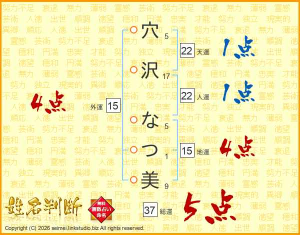 穴沢なつ美さんの総運は37画の5点!