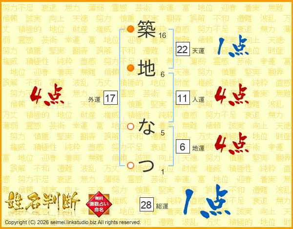 生活面を象徴する運勢です。外部から受ける影響力を表し、結婚運、家庭運や職場、環境への順応性を表します。総運から人運を引いた画数。姓や名が1文字の場合を除く。