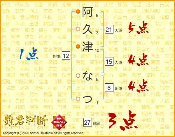 阿(8画)久(3画)津(10画) な(5画)つ(1画)