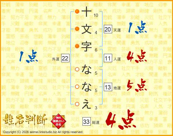 生活面を象徴する運勢です。外部から受ける影響力を表し、結婚運、家庭運や職場、環境への順応性を表します。総運から人運を引いた画数。姓や名が1文字の場合を除く。