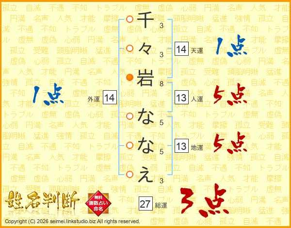 生活面を象徴する運勢です。外部から受ける影響力を表し、結婚運、家庭運や職場、環境への順応性を表します。総運から人運を引いた画数。姓や名が1文字の場合を除く。
