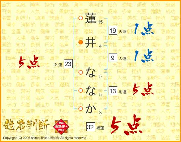 蓮(15画)井(4画) な(5画)な(5画)か(3画)