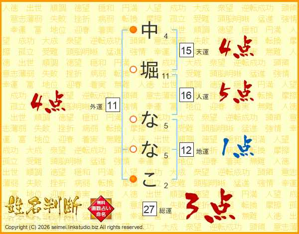 中(4画)堀(11画) な(5画)な(5画)こ(2画)